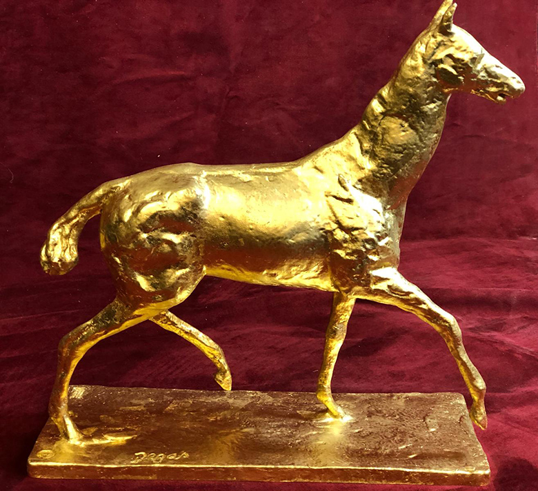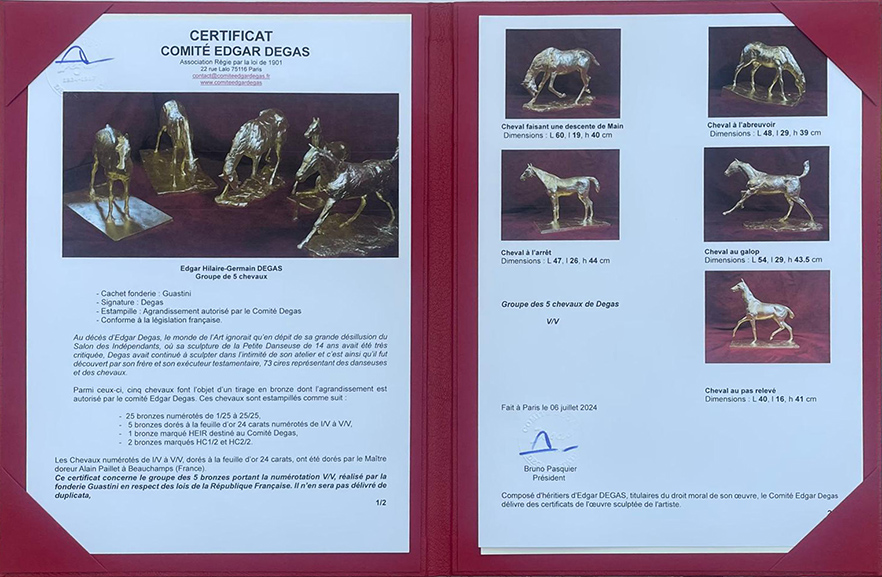 At the time of Edgar Degas' death, the art world was unaware that, despite his great success at the Salon des Indépendants, his sculpture of the Little Dancer Aged Fourteen had been very controversial, that Degas had continued to sculpt in the intimacy of his studio and that is how he was discovered by his brother and his executor, 73 works representing dancers and horses. Among these, five horses are the subject of a bronze sculpture, the enlargement of which is authorized by the Edgar Degas Committee. These horses are stamped as follows:
